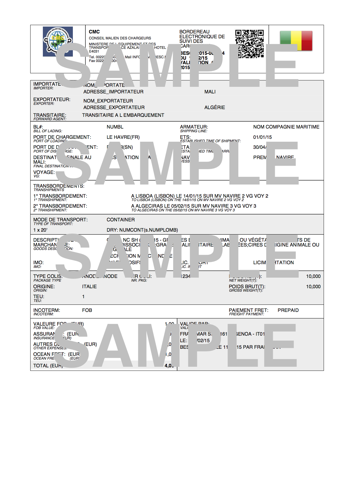 According to the bylaws of the „CMC – Conseil Malien des Chargeurs“ all shipments with final destination Mali have to be accompanied by a „BESC - Borderau Électronique des Suivi des Cargaisons“, in order to ensure the proper cargo clearance at destination. ASA GmbH issues by order and for account of the worldwide General Agent of the CMC, the FRABEMAR UK Ltd., BESC for all cargo from Germany, Austria, Poland, Lithuania, Latvia, Estonia, Scandinavia, Russia, Belarus and the Benelux Countries with final destination Mali.