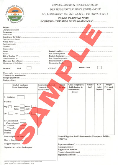 Since foundation we have the honor to represent the “CNUT – Conseil Nigérien des Utilisateurs des Transports Publics“ in Germany. We are authorized to issue for shipments with final destination Niger a “BSC - Bordereau de Suivi de Cargaison“ which is needed to allow the oncarriage to Niger. The “BSC” has to be issued and is required for the proper cargo clearance at destination. In case any kind of cargo is not accompanied by a BSC, considerable penalties will occur locally.