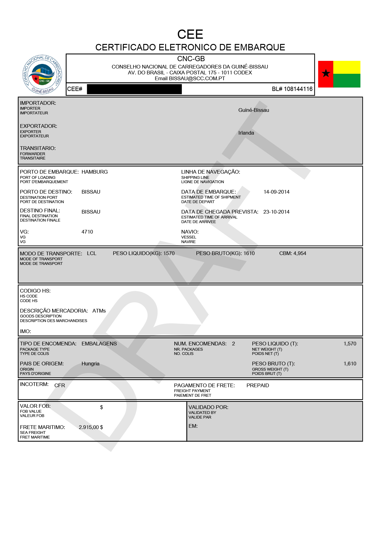 Please be informed, that considerable penalties will occur at POD in case any cargo with final destination Guinea-Bissau is not accompanied by a C.E.E..